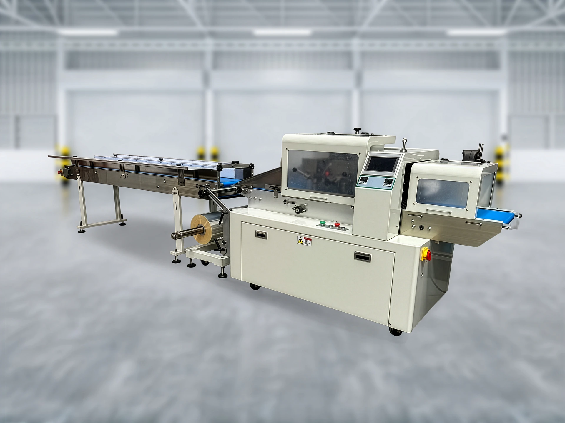 Compact inverted horizontal flow wrapper designed for efficiently packaging large products and multi-pack formats, including bakery items, frozen foods, and bulk packaged goods, with reliable performance and maximum film width for high-capacity applications.